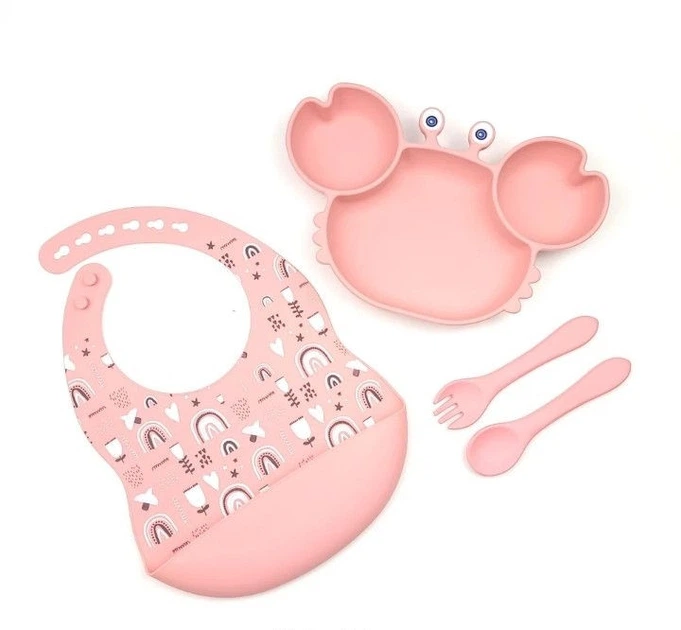 Набір дитячого силіконового посуду для першого прикорму краб 4 предмети Рожевий