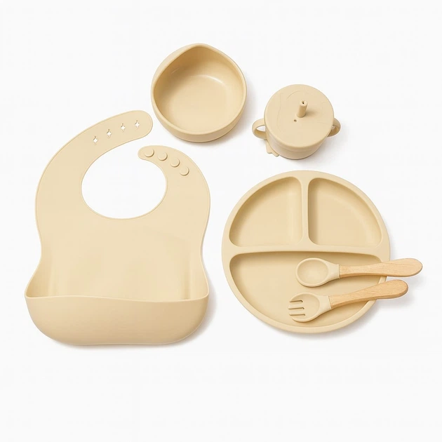 Набір дитячого посуду з 6 предметів силіконовий термостійкий бежевий