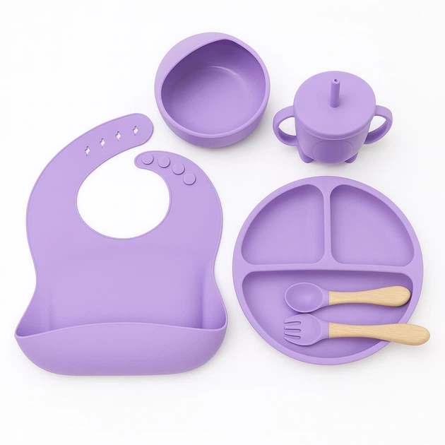 Набір дитячого посуду з 6 предметів силіконовий термостійкий фіолетовий