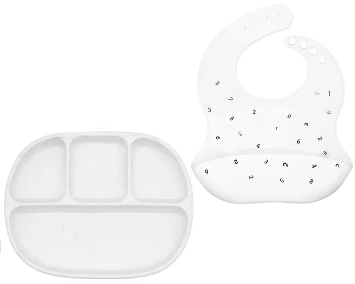 Набір силиконового посуду 2Life чотирьохсекційна тарілка D1 і слинявчик з буквами Білий n-11762