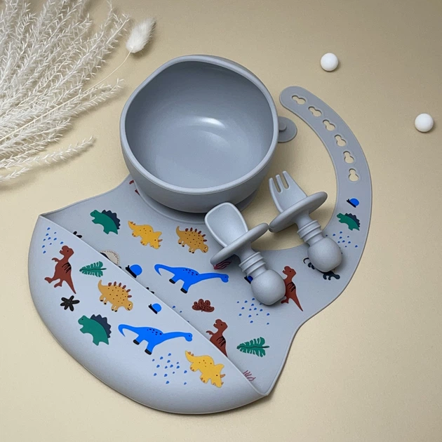 Набір посуду з харчового силікону для першого прикорму наймолодших, 4 шт. Сірий
