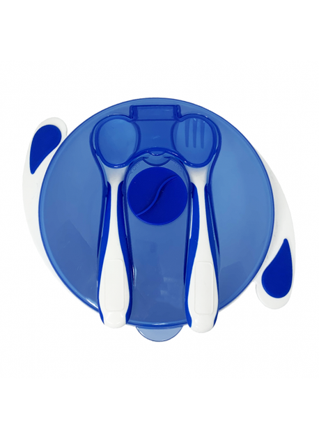 Тарілка на присоску з ложкою та вилкою синя