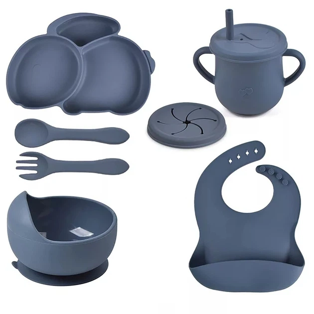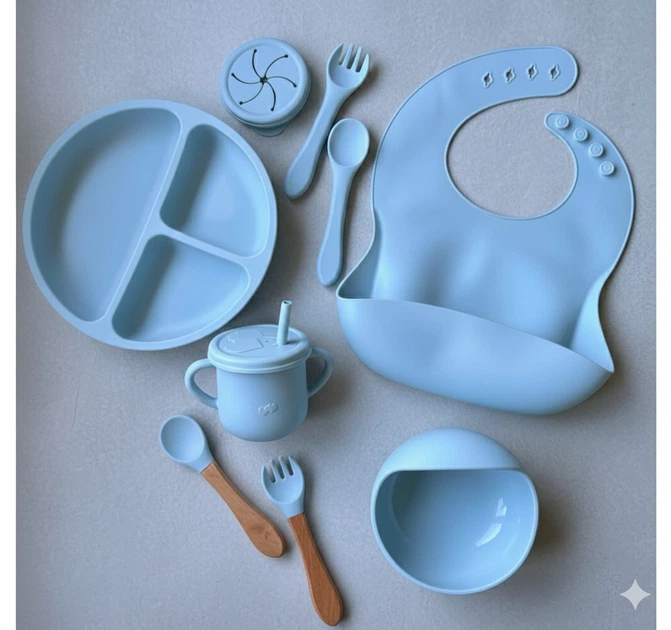 Набір дитячого силіконового посуду для першого прикорму 9 предметів на присосках Блакитний колір