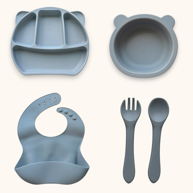 Силіконовий посуд для немовлят. Набір посуду для прикорму з п'яти предметів. Синій