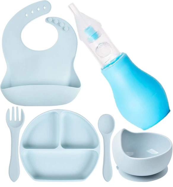 НабірY5сіліконової тарілки, слиньця, тарілка глибока, ложка,вілка, пляшка-ложка,контейнер Голубий (vol-9829)
