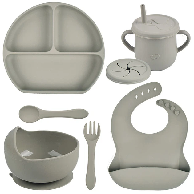 Набір силіконового посуду Y22 трьох-секційна тарілка, поїльник, ложка виделка, слюнявчик Сірий