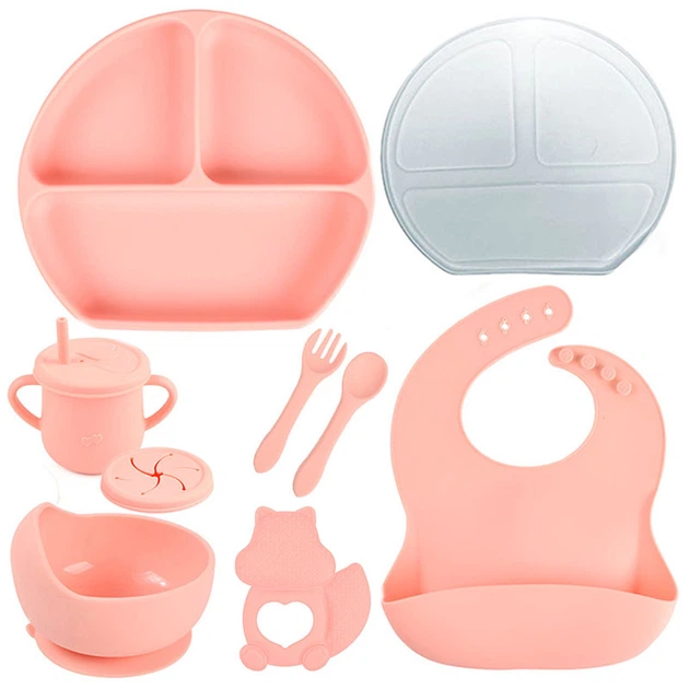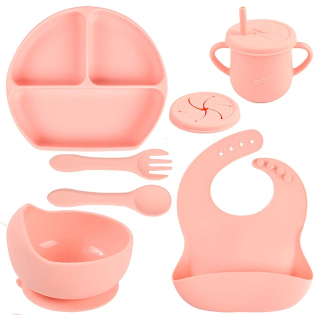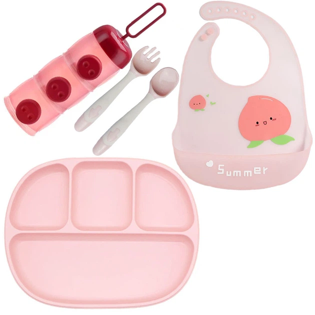 Набір силіконового посуду Y12 трьох-секційна тарілка, поїльник, ложка виделка, слюнявчик Рожевий
