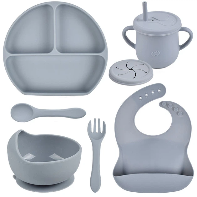 Набір силіконового посуду Y18 трьох-секційна тарілка, поїльник, ложка виделка, слюнявчик Сірий