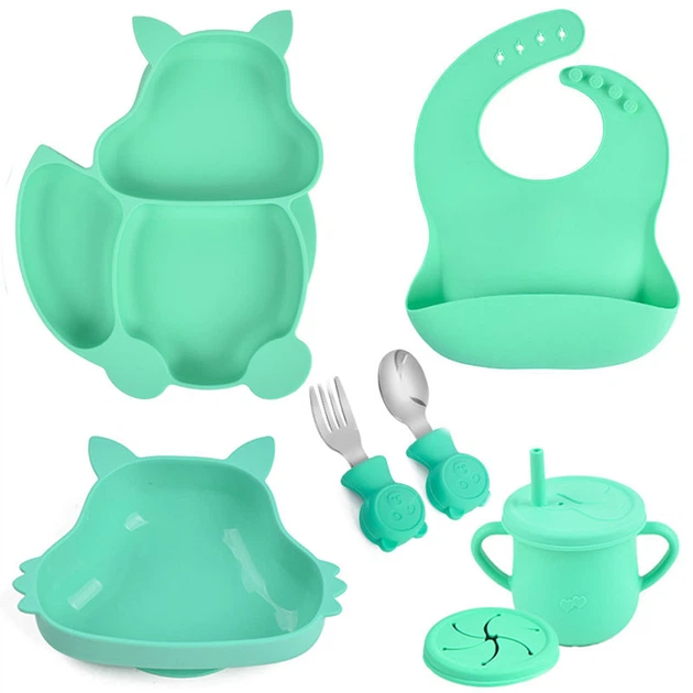 Набір силіконового посуду Y13 трьох-секційна тарілка, поїльник, ложка виделка, слюнявчик Зелений