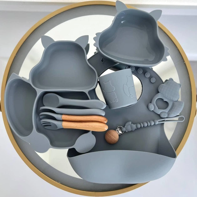 Набір дитячого силіконового посуду Білочка: Секційна тарілка Білка, слинявчик, тарілка для супу, 2 ложки, 2 вилки, поїльник,