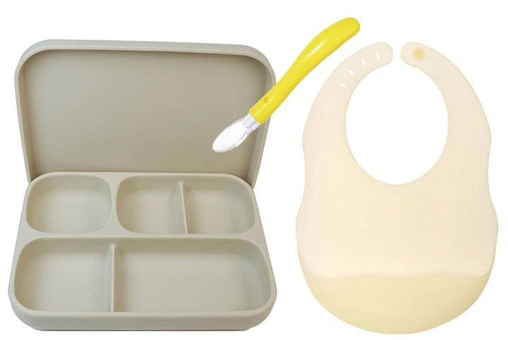 Чотирьох-секційна силіконова тарілка D7 прилади в кейсі силіконовий слинявчик М'ятний vol-10276