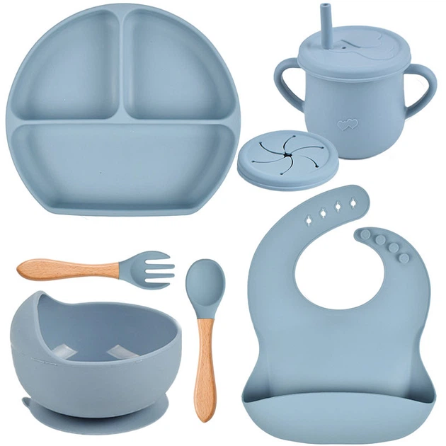 Набір силіконового посуду Y20 трьохсекційна тарілка, поїльник, ложка виделка дерев'яні, слюнявчик Сірий v-11148