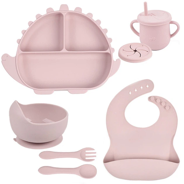 Набір силіконового посуду 2Life Y26 трьохсекційна тарілка Динозавр поїльник прибори слинявчик ніжно-фіолетовий v-11224