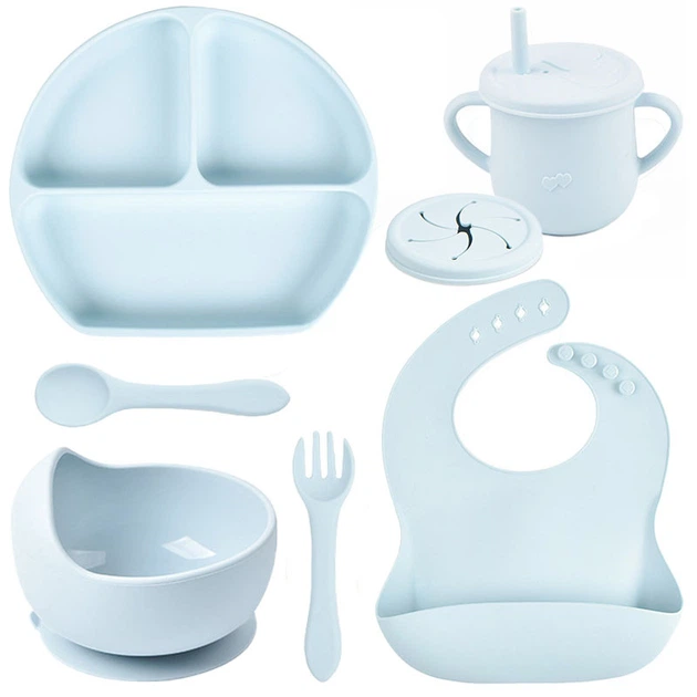 Набір силіконового посуду Y5 трьохсекційна тарілка з кришкою,поїльник,ложка виделка,слюнявчик Блакитний