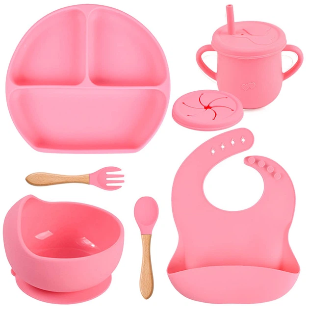 Набір силіконового посуду Y14 трьохсекційна тарілка, поїльник, ложка виделка дерев'яні, слюнявчик Рожевий v-11142