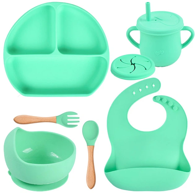 Набір силіконового посуду Y7 трьох-секційна тарілка, поїльник, ложка виделка, слюнявчик Зелений
