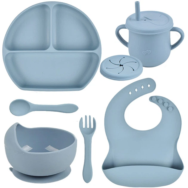 Набір силіконового посуду Y21 трьох-секційна тарілка, поїльник, ложка виделка, слюнявчик Блакитний