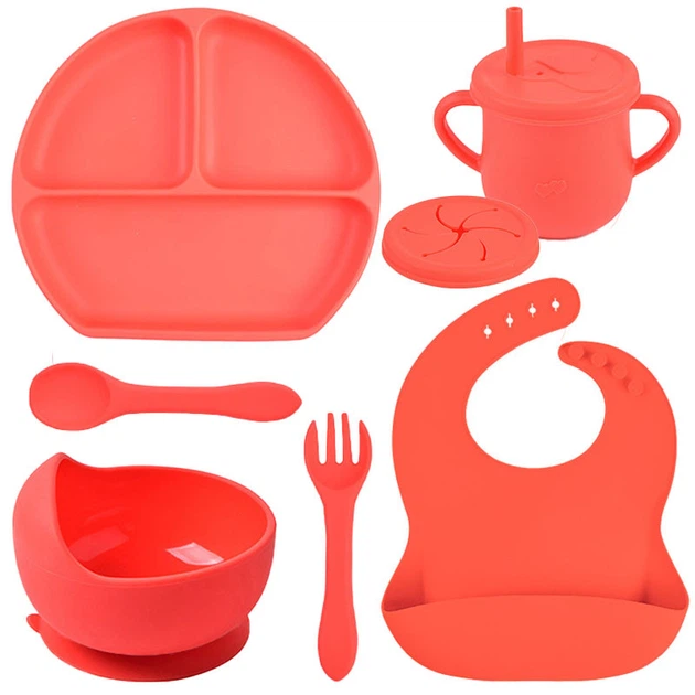 Набір силіконового посуду Y6 трьох-секційна тарілка, поїльник, ложка виделка, слюнявчик Червоний