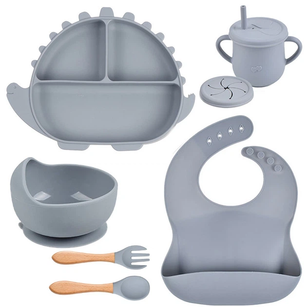Набір силіконового посуду 2Life Y18 Сірий трьохсекційна тарілка Динозавр поїльник прибори слинявчик