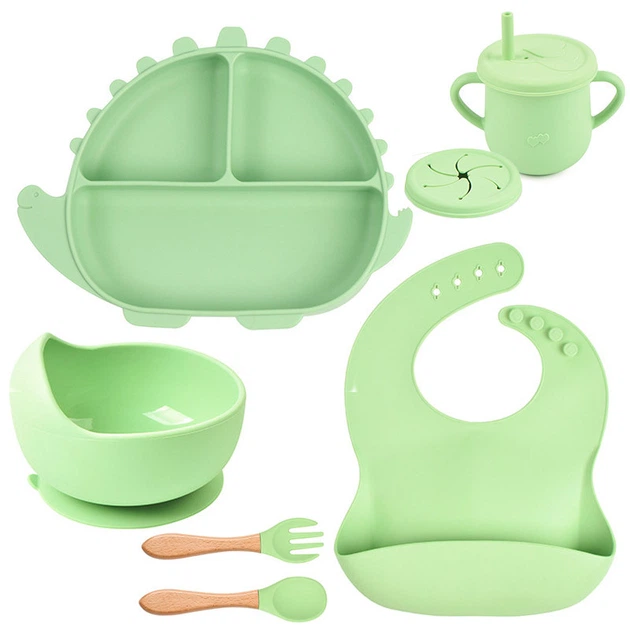 Набір силіконового посуду 2Life Y3 трьохсекційна тарілка Динозавр поїльник прибори слинявчик Зелений v-11243