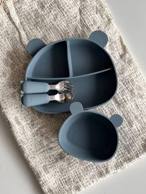 Набір дитячого силіконового посуду "Ведмедик" на присосках | Посуд для першого прикорму Темно сірий
