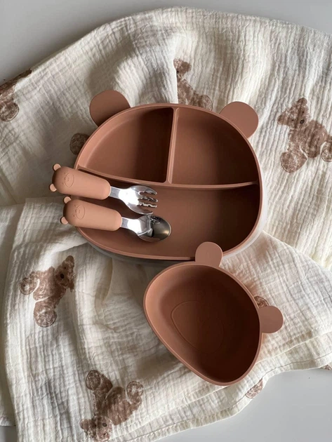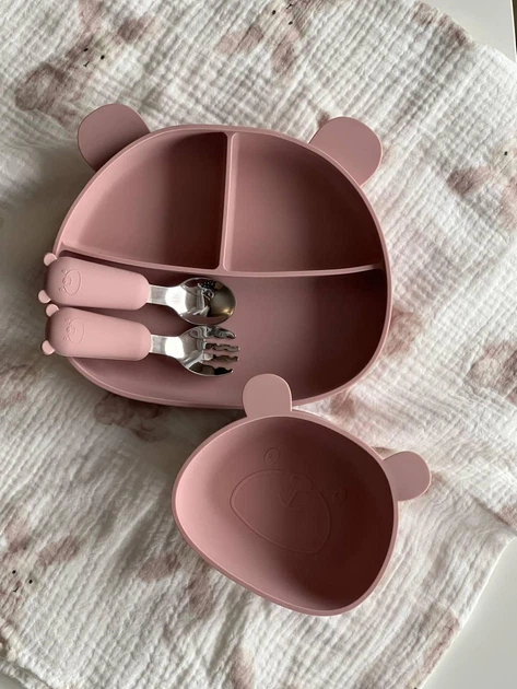 Набір дитячого силіконового посуду "Ведмедик" на присосках | Посуд для першого прикорму Пудра