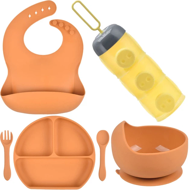 НабірY25силиконова тарілка, слиньчик, тарілка глибока, ложка, вилка, контейнер-снеки Оранжевий (n-9912)
