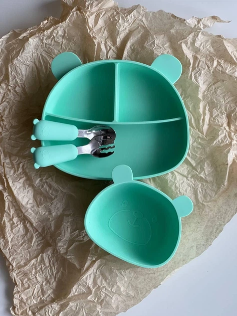 Набір дитячого силіконового посуду "Ведмедик" на присосках | Посуд для першого прикорму Мятний