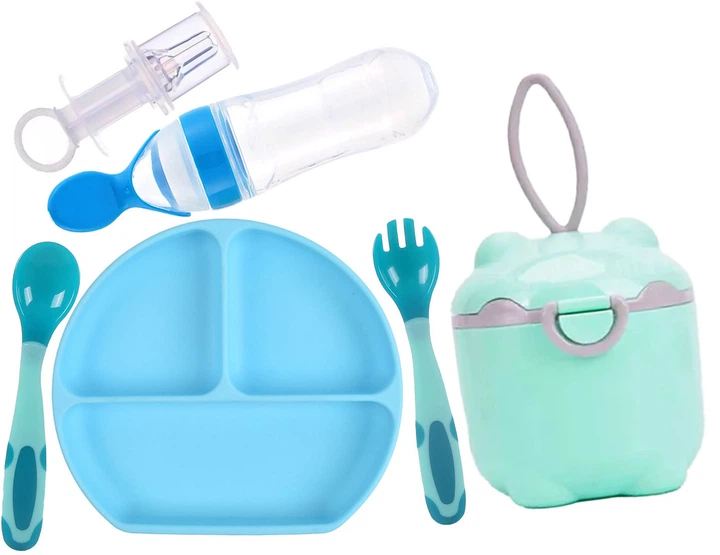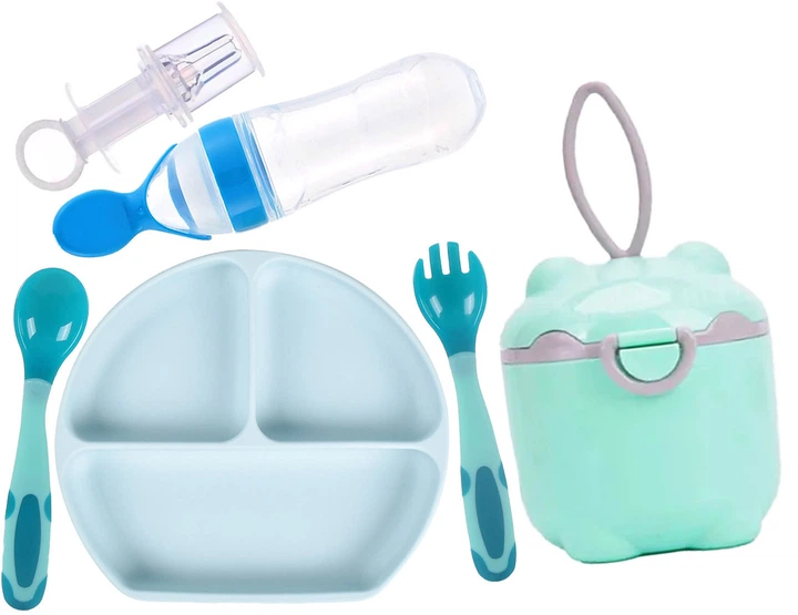 Набір 2Life Y5 силіконова тарілка, ложка, контейнери-снеки, шприц-дозатор, пляшка-ложка Блакитний (vol-10027)