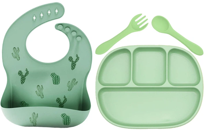 Чотирисекційна силіконова тарілка прилади в кейсі слюнявчик силіконовий 2Life 4 предмети Зелений (vol-10271)