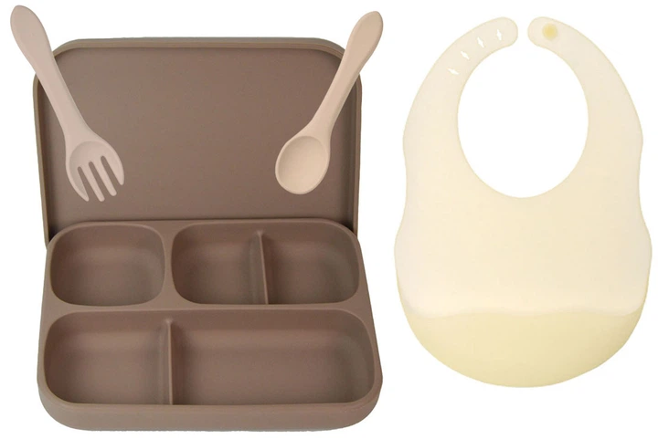 Набір силіконова тарілка слинявчик тарілка для перших страв ложка вилка 2Life Y20 6 шт Бежевий (vol-9928)