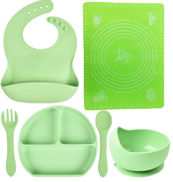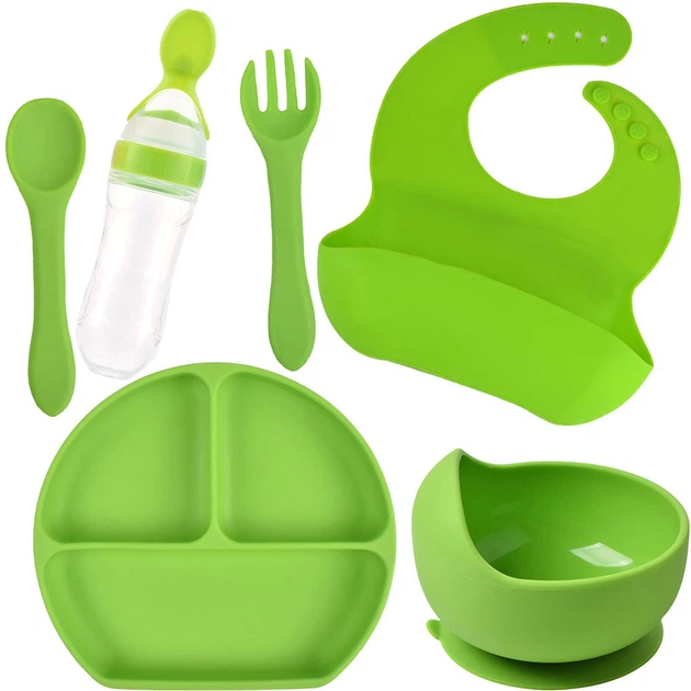 Набір силіконова тарілка слинявчик тарілка глибока ложка вилка пляшка-ложка 1-й прикорм 2Life Y7 5 шт Зелений (vol-9760)
