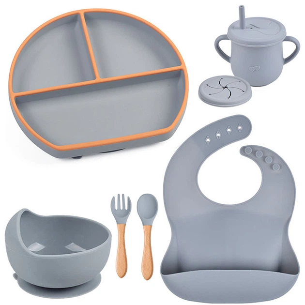 Набір дитячого силіконового посуду 2Life Y18 із 7 предметів із дерев'яними приладами Сірий (v-11364)