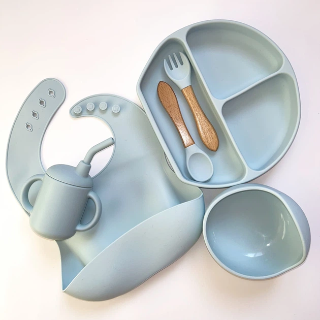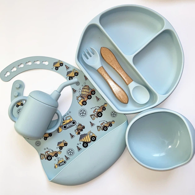 Набір дитячого посуду з харчового силікону: тарілка на присосці, прибори, поїльник, нагрудник для першого прикорму, 4 шт. Бе