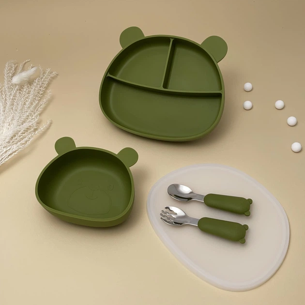 Набір посуду з харчового силікону на присосці для першого прикорму Ведмедик 5 шт. Хакі