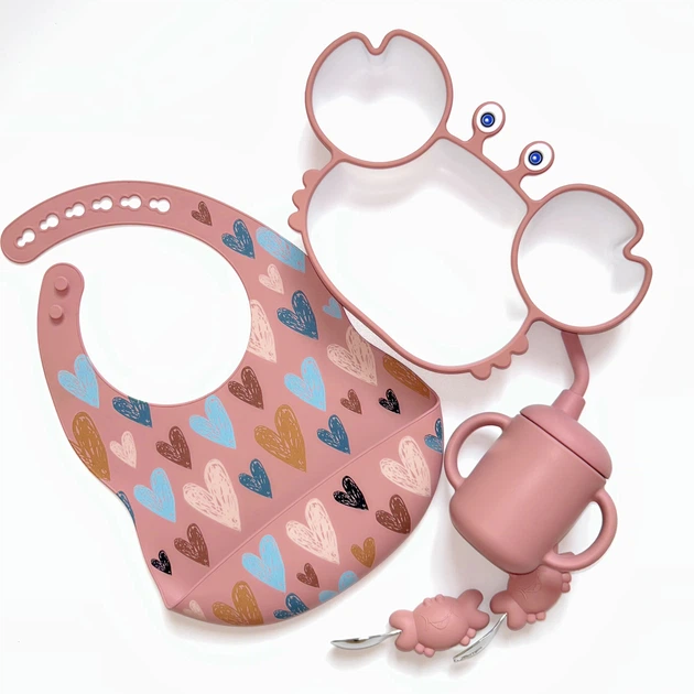 Набір дитячого посуду Силіконова тарілка та слинявчик у коробці 9х16х11 см Mega Zayka Рожевий 000282016