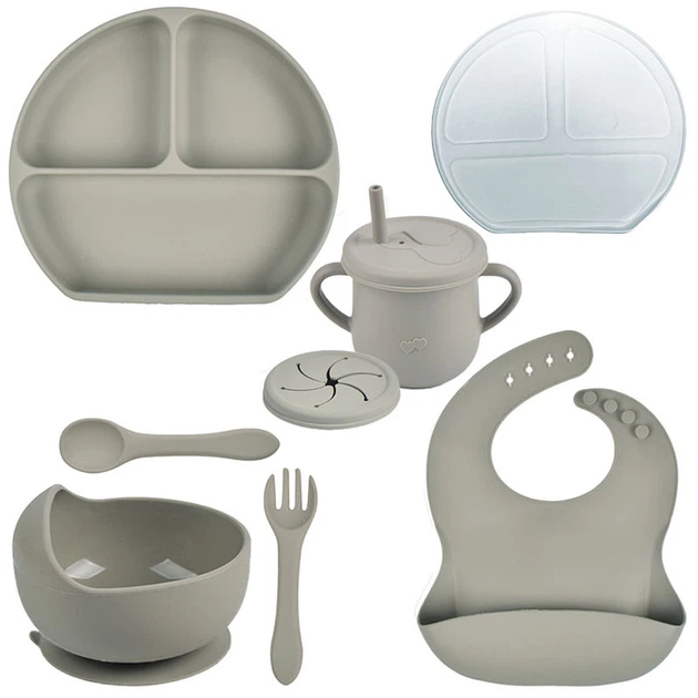 Набір силіконового посуду Y22 трьохсекційна тарілка з кришкою,поїльник,ложка виделка,слюнявчик Сірий