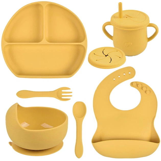 Набір силіконового посуду Y11 трьохсекційна тарілка з кришкою,поїльник,ложка виделка,слюнявчик Жовтий