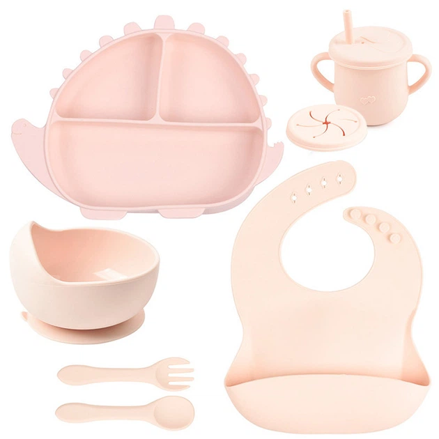 Набір силіконового посуду 2Life Y4 трьохсекційна тарілка Динозавр поїльник прибори слинявчик Рожевий v-11212