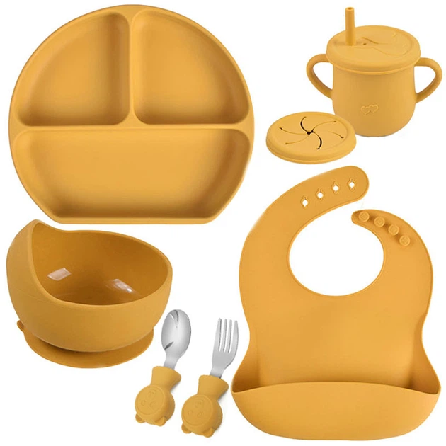 Набір силіконового посуду Y11 трьохсекційна тарілка з кришкою,поїльник,ложка виделка,слюнявчик Жовтий