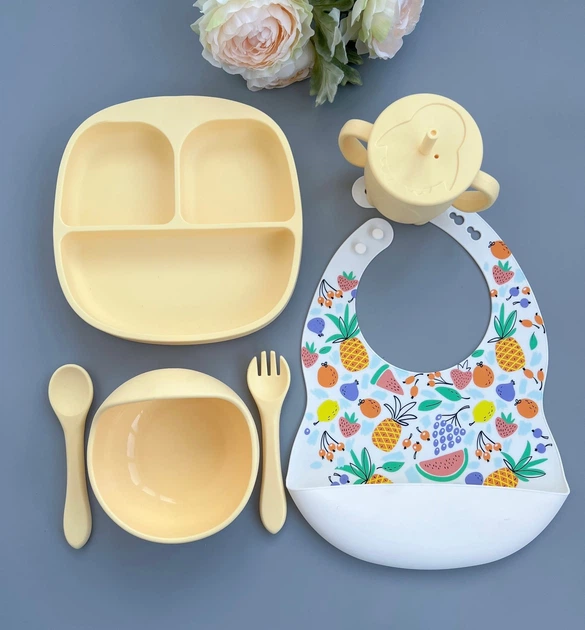 Набір силіконового посуду для прикорму 6 предметів Жовтий ВР 180, нагрудник білий принт Фрукти