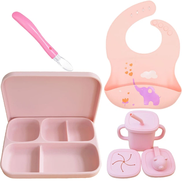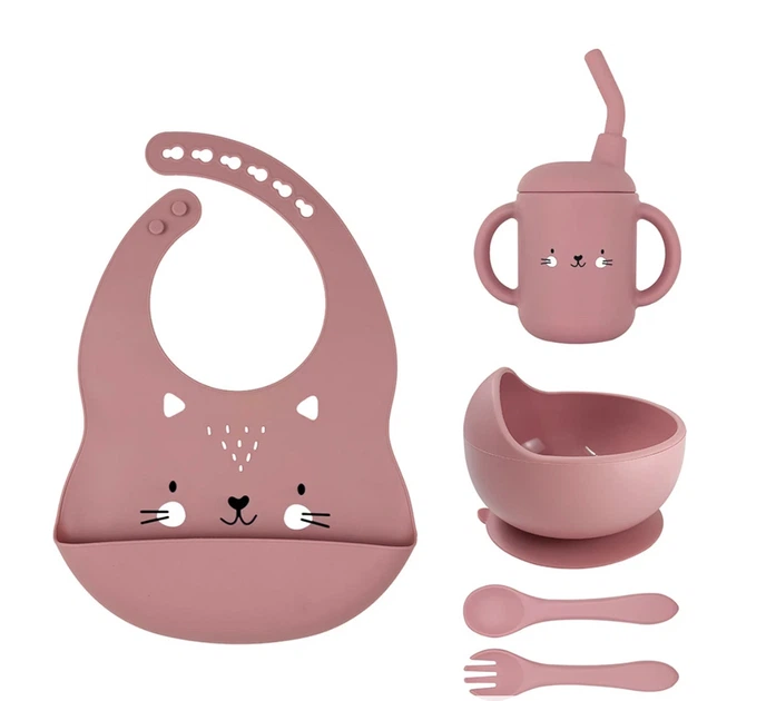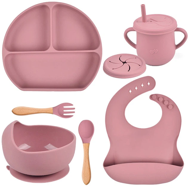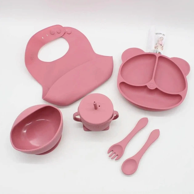 Набір дитячого посуду 6 предметів рожевий силікон для годування
