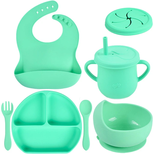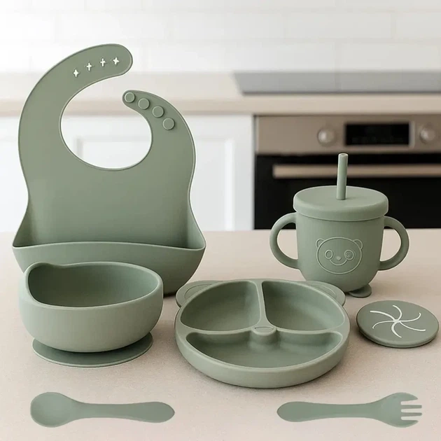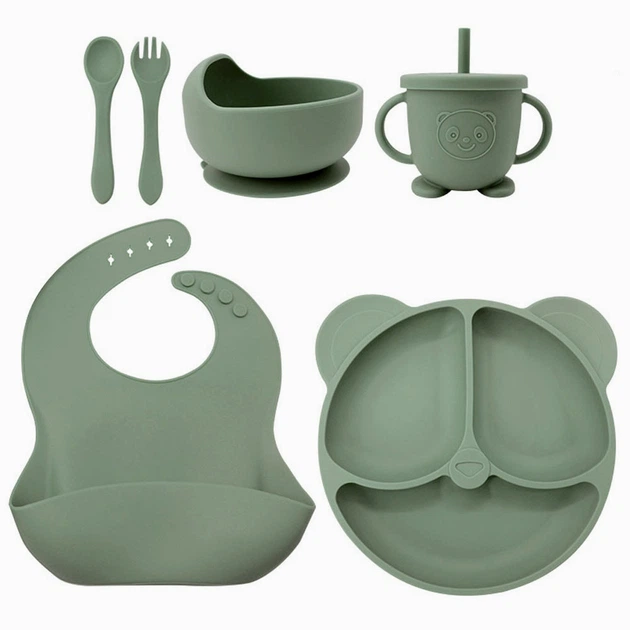 Набір дитячого силіконового посуду 6 предметів зеленого кольору для годування