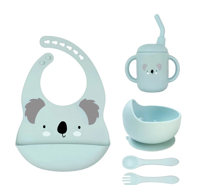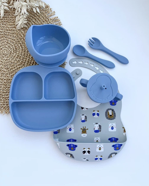 Набір силіконового посуду для прикорму для хлопчика 6 предметів Синій пудровий ВР103, нагрудник Звірі