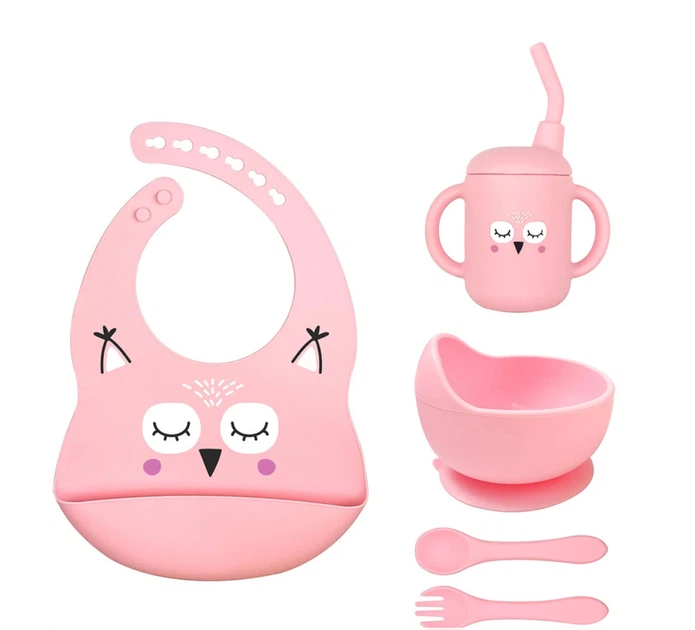 Набір силіконового посуду для прикорму для дівчинки 6 предметів Ніжно рожевий ВР136, нагрудник Конфеті