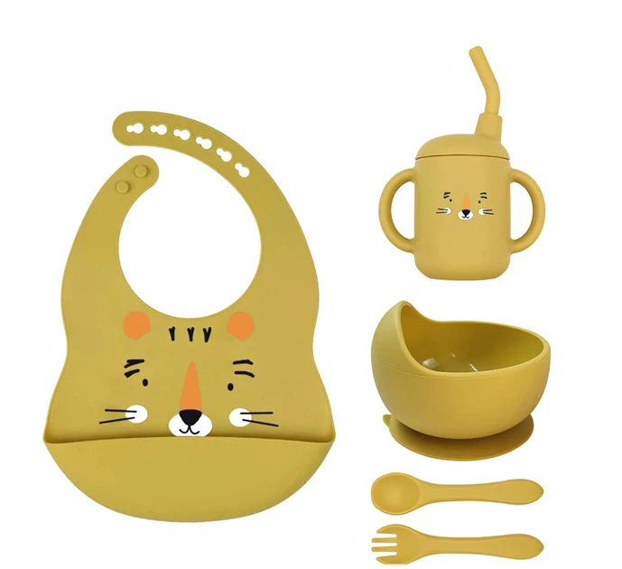 Набір силіконового посуду для прикорму для дівчинки 6 предметів Жовтий ВР 173, нагрудник Пончики