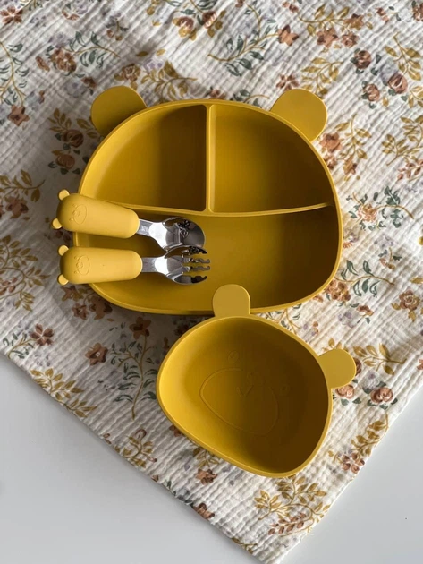 Набір дитячого силіконового посуду "Ведмедик" на присосках | Посуд для першого прикорму Гірчиця
