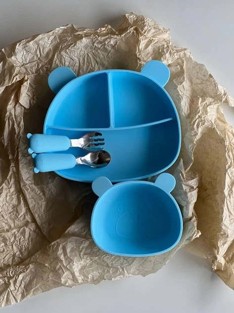 Набір дитячого силіконового посуду "Ведмедик" на присосках | Посуд для першого прикорму Блакитний