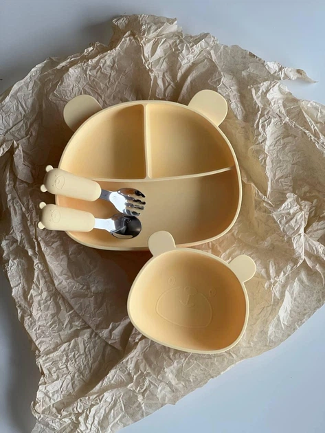 Набір дитячого силіконового посуду "Ведмедик" на присосках | Посуд для першого прикорму Жовтий