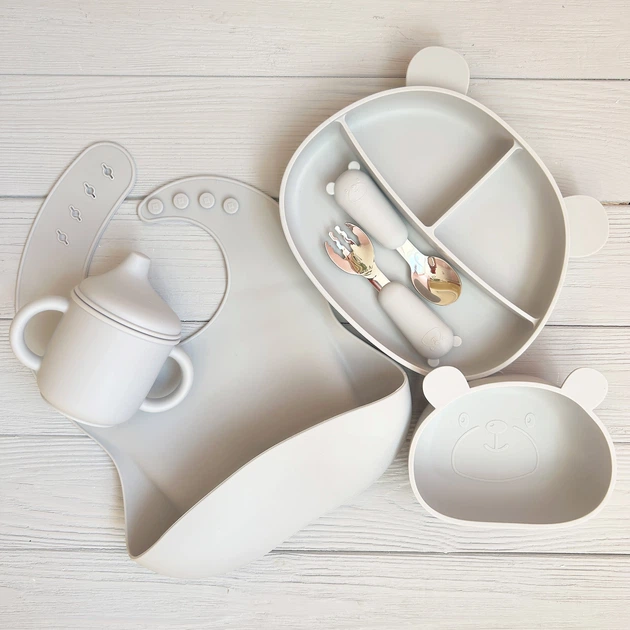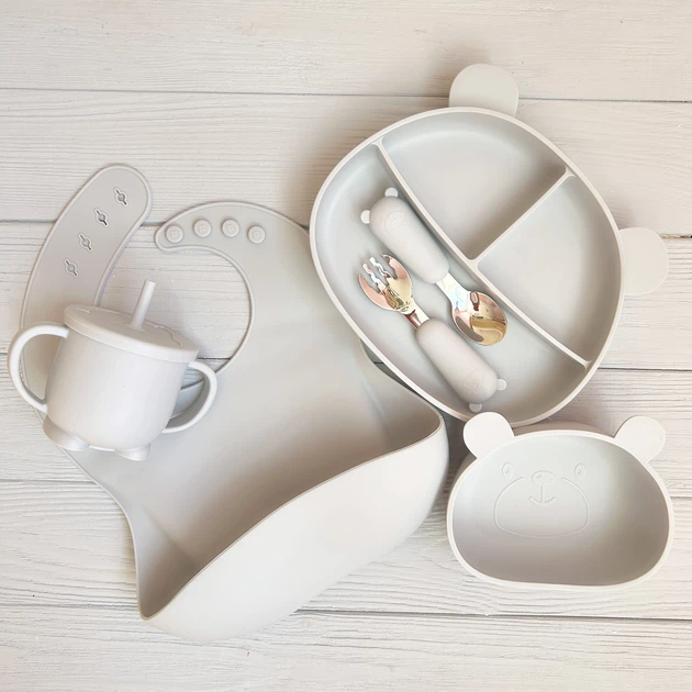 Набір дитячого силіконового посуду класичний сіро-синій Пакунок малюка